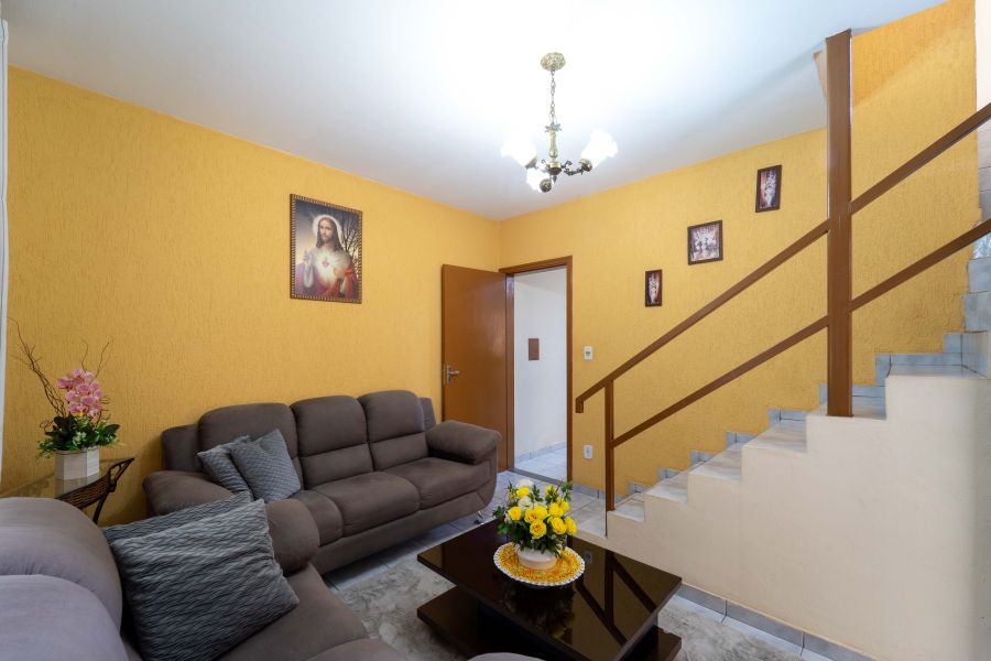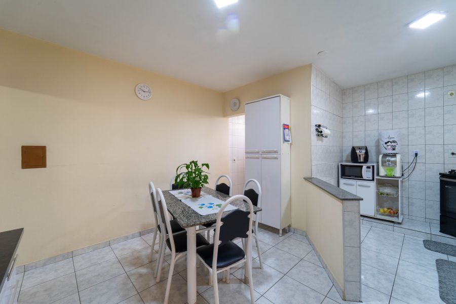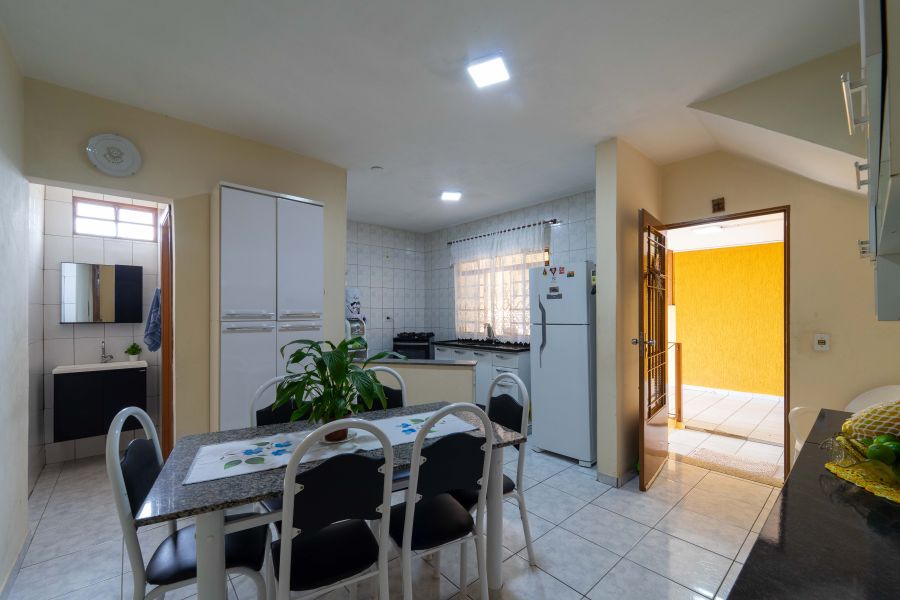 No pavimento térreo, a sala de estar convida para a convivência em família e a sala de jantar integrada a cozinha formam um ambiente bastante funcional. Há também um banheiro social que atende com conforto essa área da casa.